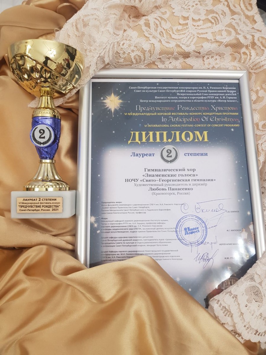 9 декабря участники хора «Знаменские голоса» Свято-Георгиевской гимназии г. Красногорска со своим руководителем, учителем музыки и церковного пения Л.А. Панасенко, отправились в Санкт-Петербург для участия в VI Международном фестивале-конкурсе «Предчувствие Рождества Христова». Хор подготовил к конкурсу специальную программу, состоящую из Рождественских песен и колядок, за которое жюри удостоило гимназический хор диплома Лауреата II степени.