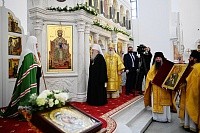В дар новоосвященному храму Предстоятель Русской Православной Церкви передал икону Божией Матери «Неувядаемый Цвет.