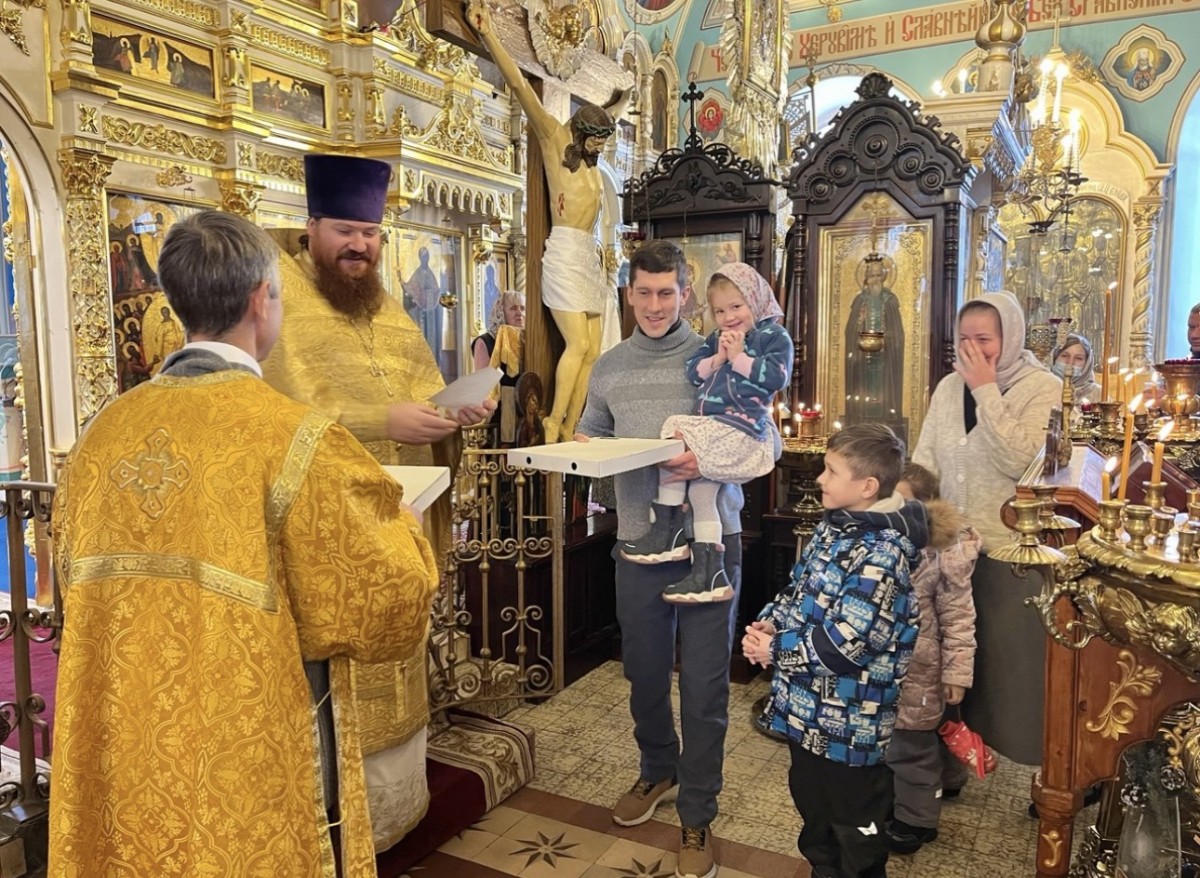 1 февраля, по окончании Литургии, иерей Михаил Калачиков, настоятель Никольского прихода г. Красногорск, поздравил всех собравшихся с прошедшим днем памяти святых Кирилла и Марии Радонежских, покровителей семьи, и обратился со словами поддержки и поздравления к многодетным семьям прихода. Всем многодетным семьям иерей Михаил вручил пироги к семейному чаепитию.
