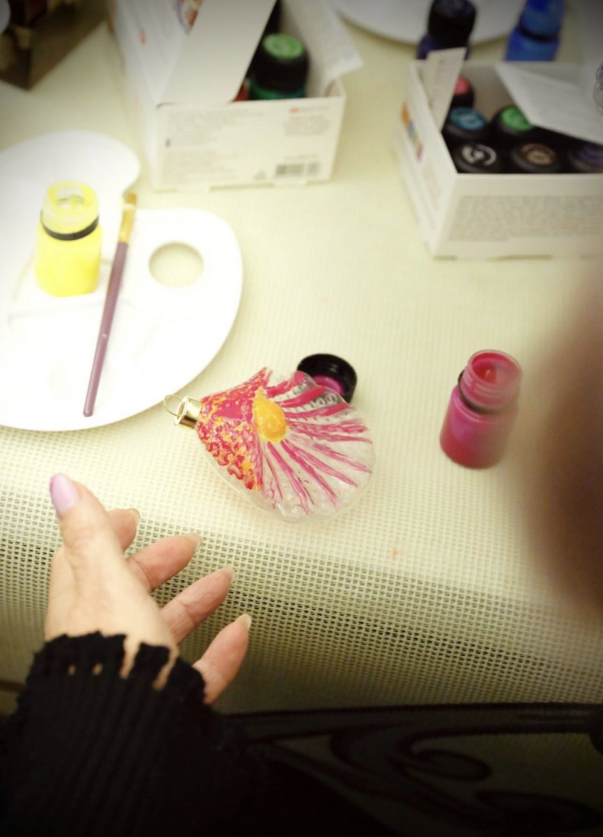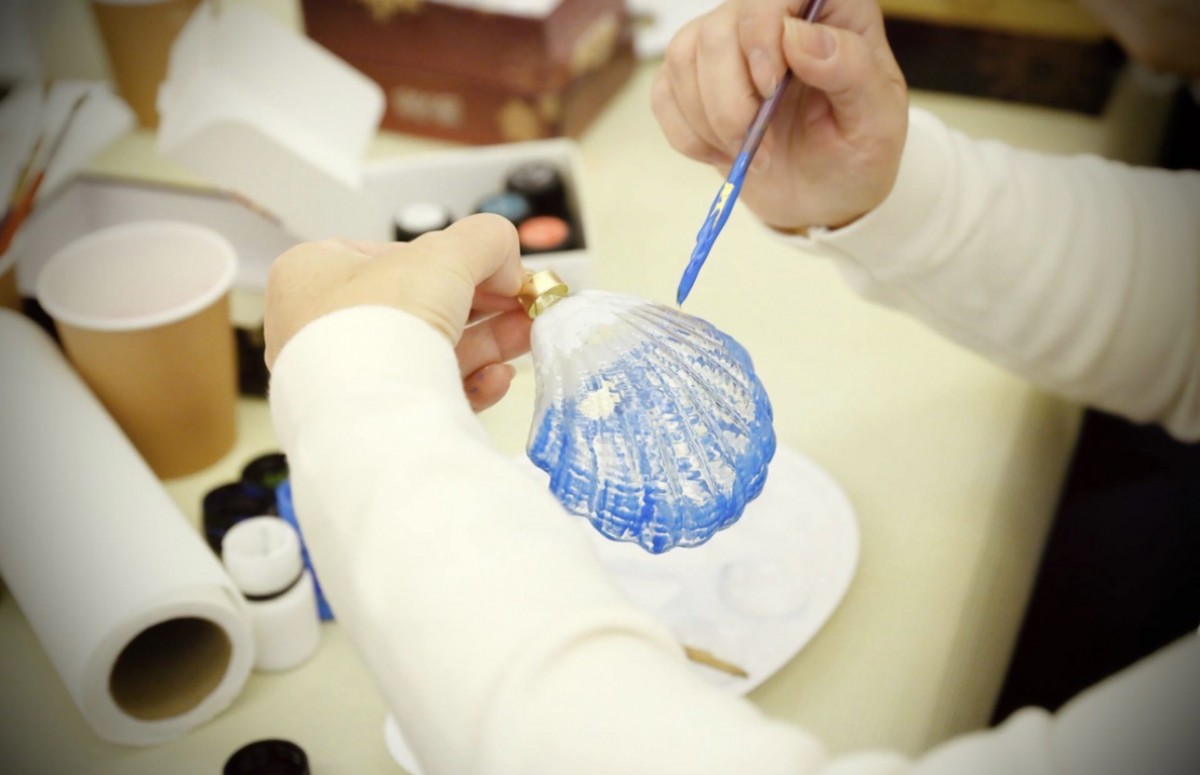 Кроме того, руководитель студии «Серебряная кисточка» Валерия Александровна Попова провела мастер-класс по изготовлению украшений для рождественской елки: участники разукрашивали ракушки, превращая их в праздничные игрушки для рождественской елки.